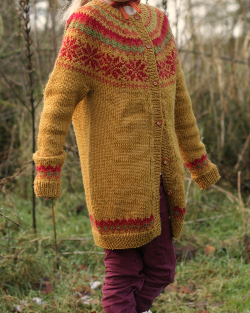 I started off with the Nancy cardigan pattern and let the girl pick the colours. After years of endless pink, she chose mustard yellow to my big surprise! This pattern is quite brief, so if you're a bit unfamiliar with knitting colourwork, I'd recommend to check out some extra information sources like this excellent video on stranded colourwork. For good and extensive background information on how to make a steek, I looked here.